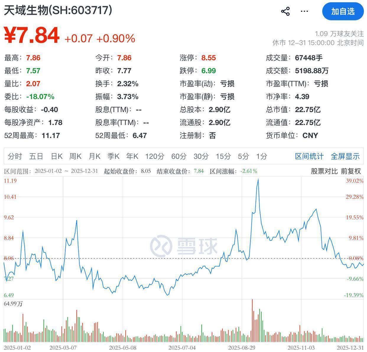 二级市场上,截至2025年12月31日收盘,天域生物上涨0.90%报7.84元/股,总市值22.75亿元。