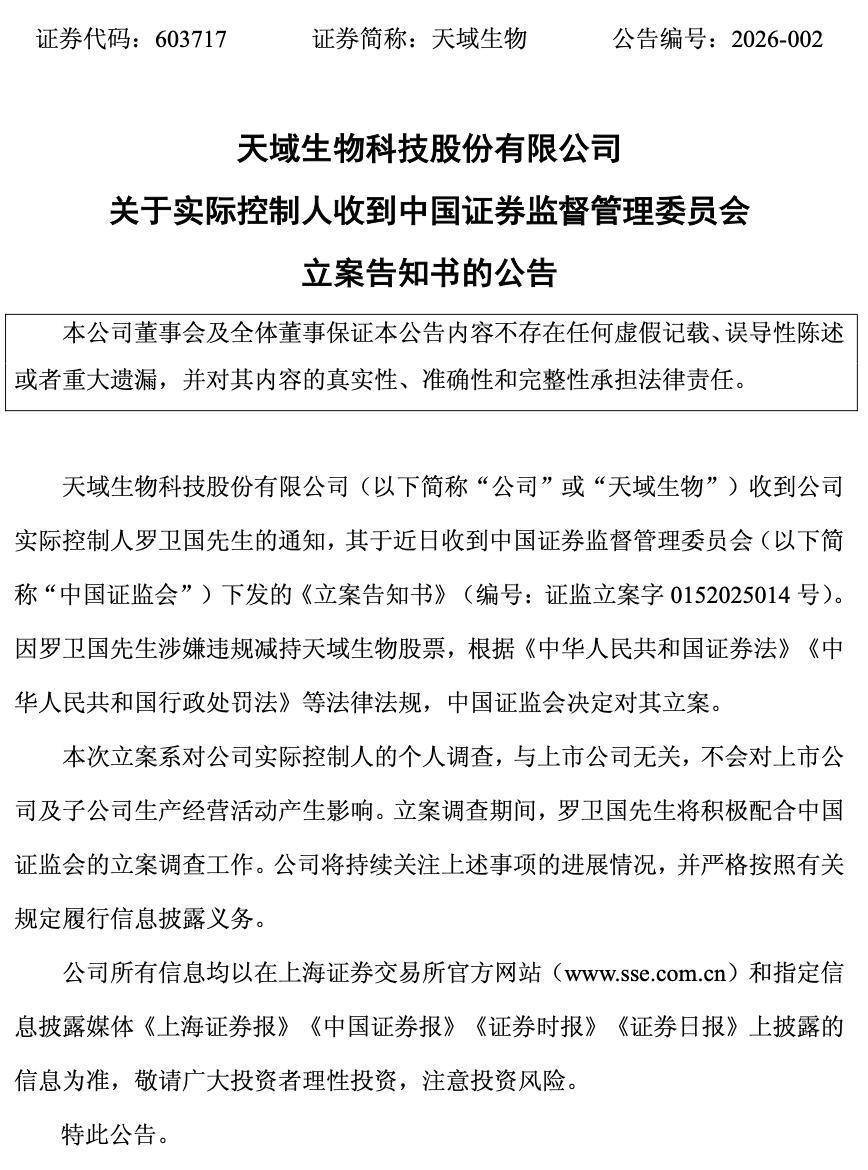 天域生物表示,本次立案系对公司实际控制人的个人调查,与上市公司无关,不会对上市公司及子公司生产经营活动产生影响。立案调查期间,罗卫国将积极配合中国证监会的立案调查工作。公司将持续关注上述事项的进展情况,并严格按照有关规定履行信息披露义务。