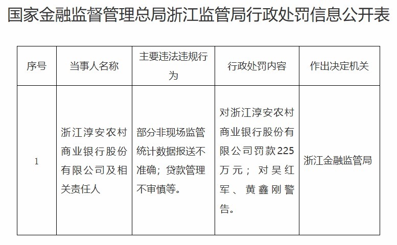 【大河财立方消息】2025年12月31日股票配资代理网,国家金融监督管理总局浙江监管局披露的行政处罚信息公开表显示,因部分非现场监管统计数据报送不准确、贷款管理不审慎等,浙江淳安农村商业银行股份有限公司被罚225万元。